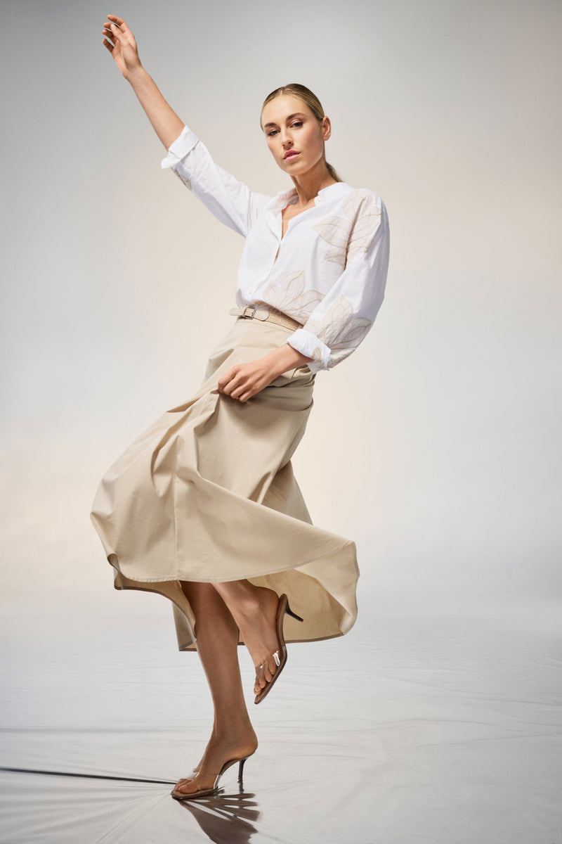 Materialen bepalen het gevoel. Een rok in zuiver katoen met een krokantere touch houdt mooi vorm en creëert een fris silhouet. Een witte blouse met beige borduurwerk voegt verfijning toe.