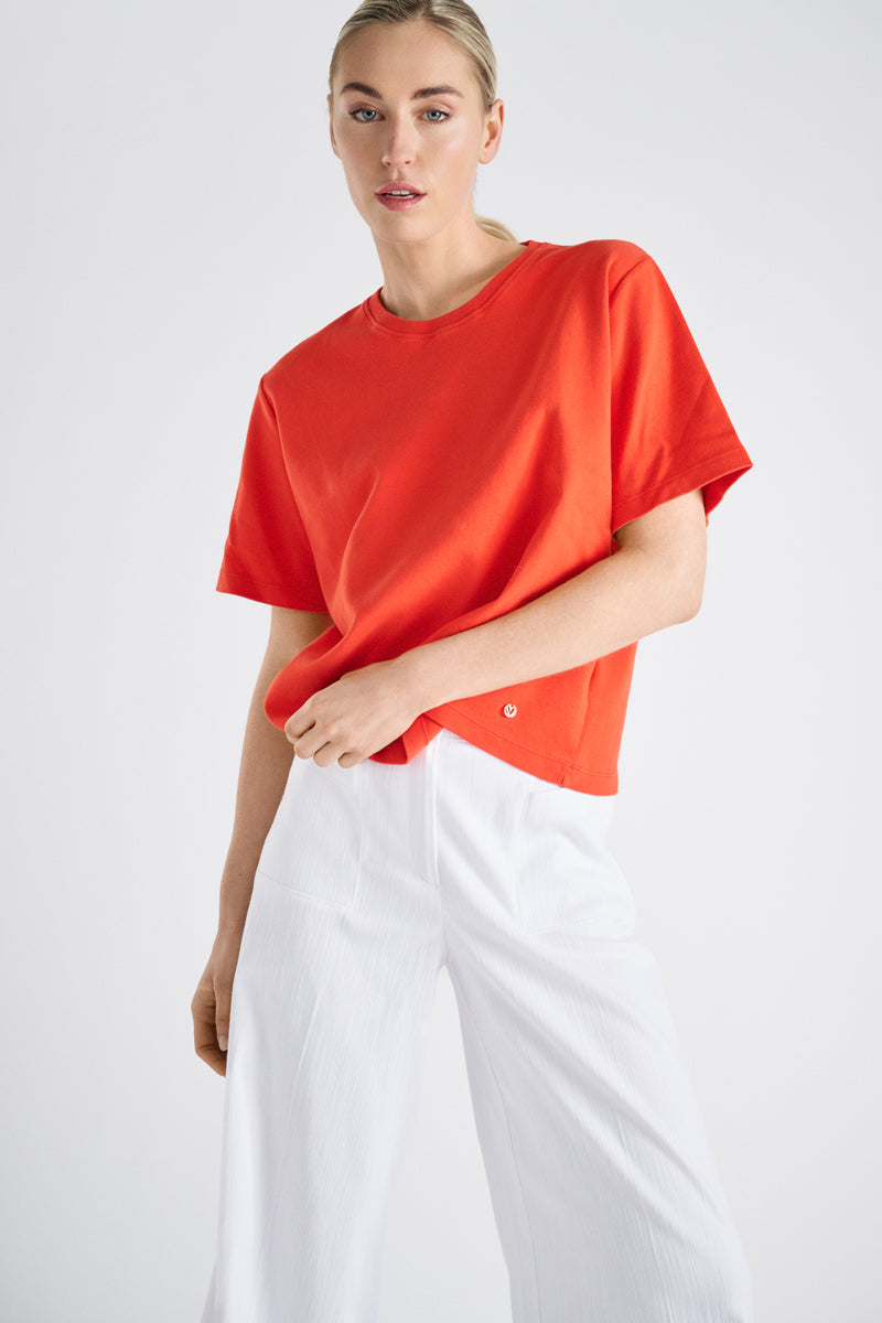Een frisse essential met karakter: dit koraal boxy T-shirt in stevige interlock katoen voelt zacht aan en behoudt mooi zijn vorm. Het wijde volume geeft een moderne, relaxte uitstraling. Verkrijgbaar in wit, roze en koraal. Draag het solo of als perfecte basis onder een blazer of bloes, voor elke dag opnieuw.