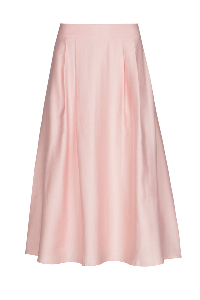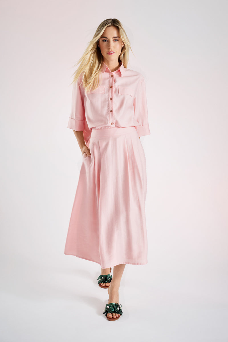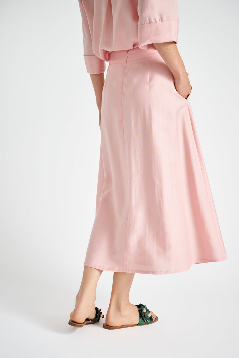 Soepele, wijde rok met bandplooien, platte tailleband en zakken. Super luchtig en volumineus, op een chique kuitlengte om overal en altijd te kunnen dragen. Chic of sportief.