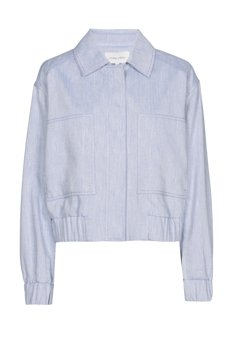 Kort jasje met kraag en drukknopen in lichte, zomerse denim. Comfortabele elastiek aan mouwen en taille. Grote opgestikte borstzakken. Combineer met de bijpassende broek voor een stijlvolle en sportieve total look .