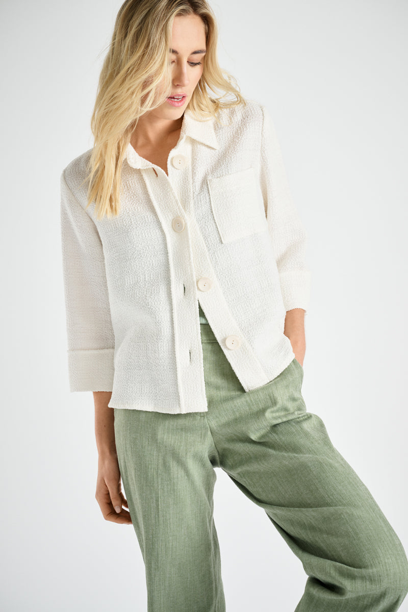 Dressy shirt-jacket with a chic structure in the fabric. Buttons on the front, shirt collar, breast pocket. Very versatile. Pair it with jeans or wear it more formal.
