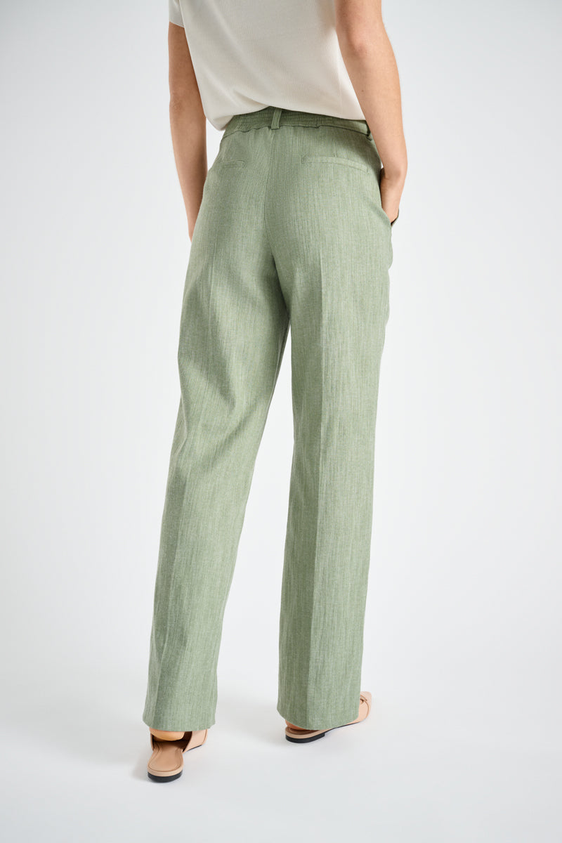 Straight green denim look pants with front pleat for elegance and elastic waist for comfort. These long and fluid summer pants look like denim, without the rigidity of jeans. Suit every occasion.