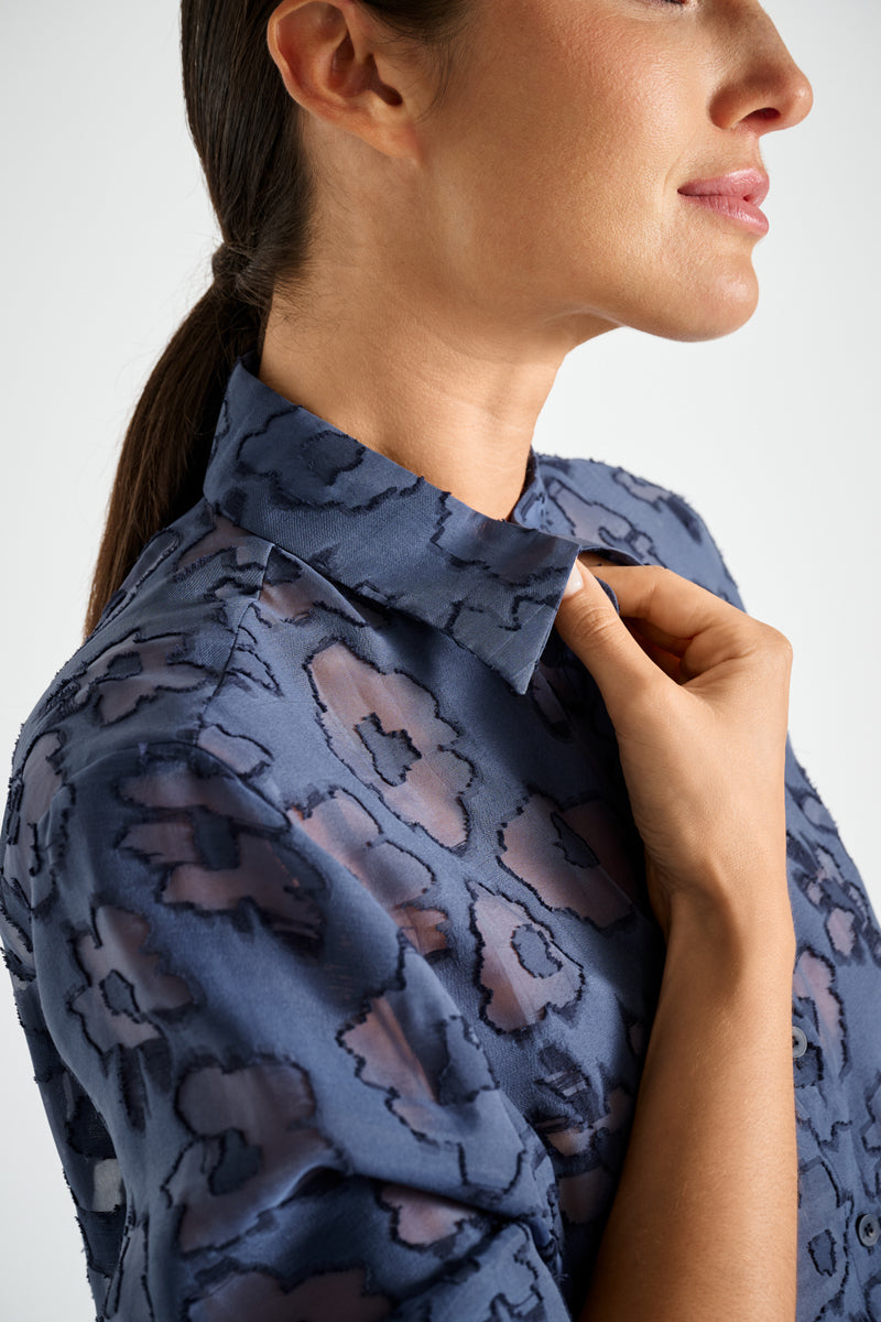 Chemisier élégant en matière à imprimé floral légèrement transparente. Parfait avec un top en-dessous pour un look stylé. Pour toutes vos occasions festives : classe avec une touche romantique.
