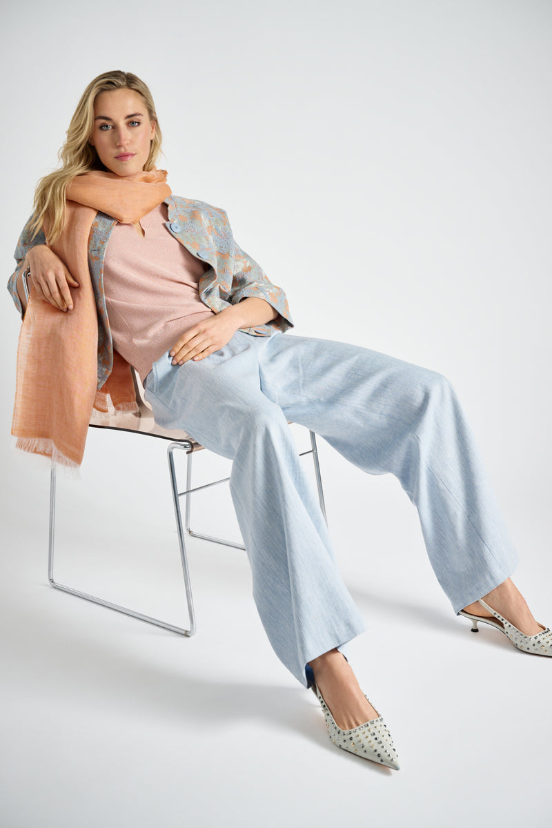 Longue et belle écharpe unie dans un mélange de lin léger et doux. Se marie parfaitement aux autres coloris du même thème.