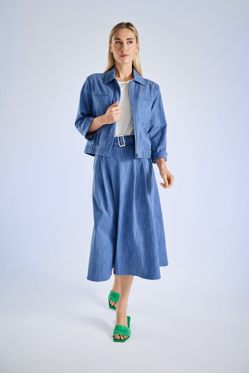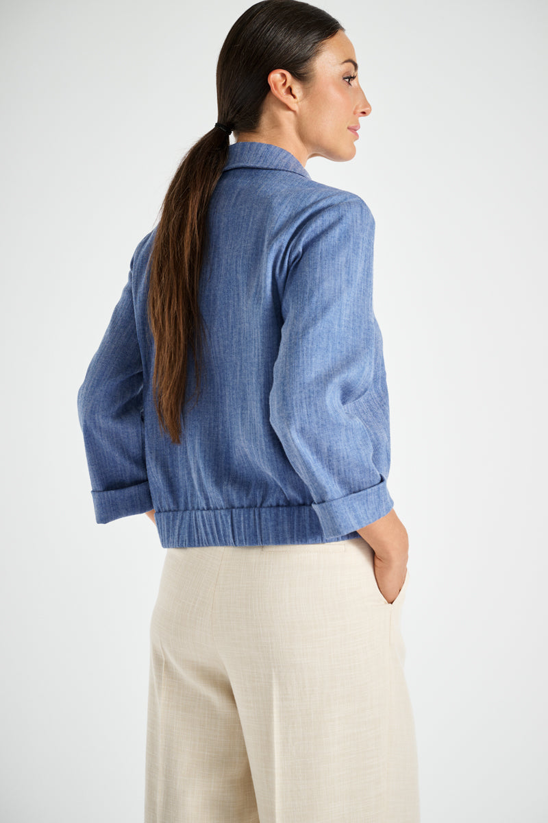 Korte denim bomberjas met ritssluiting en kraag. Elastiek in de taille, borstzakjes, omgedraaide mouw. Super speels en toch gekleed, voor een apart, stijlvol en sportief pak met de broek of rok in dezelfde kwaliteit.